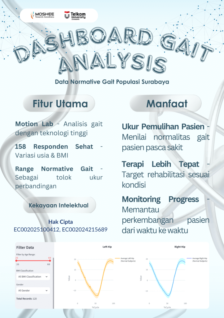The Gait Analysis Dashboard (Normative Gait Data of the Surabaya Population) is a flagship research outcome developed by the Center of Excellence (CoE) Motion Technology for Safety, Health, and Wellness (MOSHEE) under the Research Institute of Sustainable Society (RISS), Telkom University. This product is a web-based platform designed to support the analysis of human gait patterns, using normative gait data from a healthy population as its reference.
