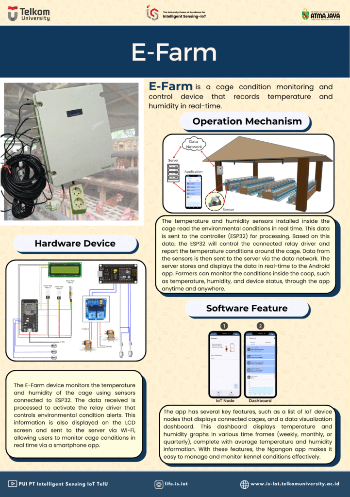 E-Farm is an Internet of Things (IoT)-based innovation developed by the Center of Excellence PUI-PT Intelligent Sensing-IoT (IS-IoT) at Telkom University, supported by RISS (Research and Innovation for Smart Society). The system is designed to help poultry farmers monitor coop conditions in real time and automatically, making farm management more efficient, precise, and modern.