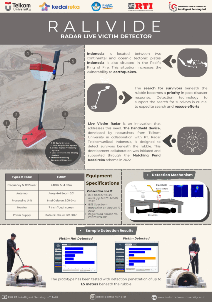 Untuk menjawab tantangan tersebut, dikembangkanlah RALIVIDE (Radar Live Victim Detector). RALIVIDE adalah perangkat genggam berbasis radar yang dirancang khusus untuk mendeteksi keberadaan korban selamat di bawah reruntuhan bangunan. Berbekal teknologi radar yang mampu menembus material padat, RALIVIDE dapat mengidentifikasi pergerakan dada korban saat bernapas secara real-time. Dengan begitu, tim penyelamat bisa langsung mengetahui lokasi korban yang masih hidup, sehingga proses penyelamatan dapat dilakukan lebih cepat, lebih terarah, dan jauh lebih efisien.