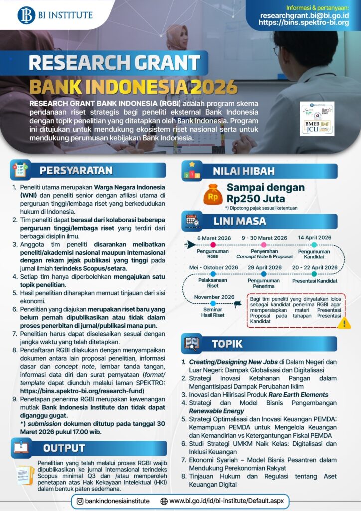 Research Grant Bank Indonesia (RGBI) merupakan program pendanaan riset strategis yang diselenggarakan oleh Bank Indonesia Institute untuk peneliti eksternal dari perguruan tinggi dan lembaga riset di Indonesia. Program ini bertujuan mendukung penguatan ekosistem riset nasional serta menyediakan kajian akademik yang dapat menjadi referensi dalam perumusan kebijakan Bank Indonesia. Proposal penelitian harus sesuai dengan topik yang telah ditetapkan oleh Bank Indonesia dan diajukan melalui sistem SPEKTRO.